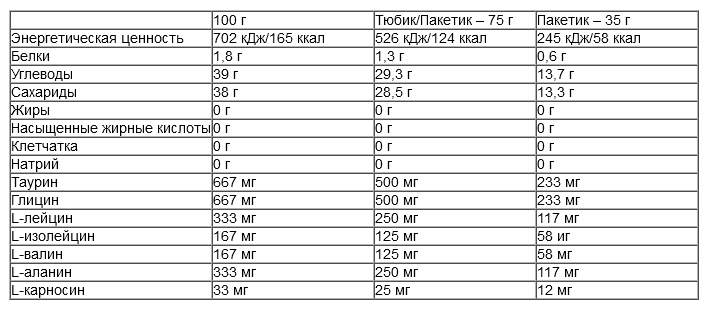 Абрикос: вода, изомальтулоза (источник фруктозы и глюкозы), глюкоза, загуститель ксантановая камедь, таурин, глицин, L-лейцин, L-аланин, регуляторы кислотности лимонная и оксиянтарная кислота, L-изолейцин, L-валин, ароматизатор, консерванты бензоат натрия и сорбиновая кислота, краситель бета-каротин (только для вкуса абрикос), L-карнозин, подсластители ацесульфам К и сукралоза.